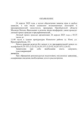 Приём граждан, посвященный Международному дню защиты детей, пройдет 30.05.2025 с 9:00 часов до 16:00 часов, в здании прокуратуры района по адресу: с. Илек, ул.Красноармейская, д.43.